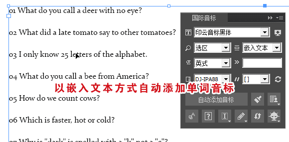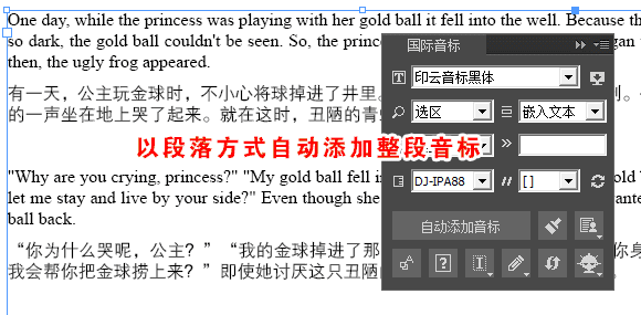自动生成整段的音标内容插件可以自动在选择的文本中按段落的内容生成整段的音标内容,音标内容跟随文本段落。