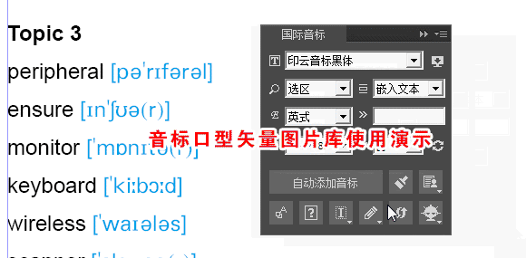 自动输出音标发音口型图插件提供音标口型图素材,可以一键输出到ID版面中,独家功能、方便快捷。