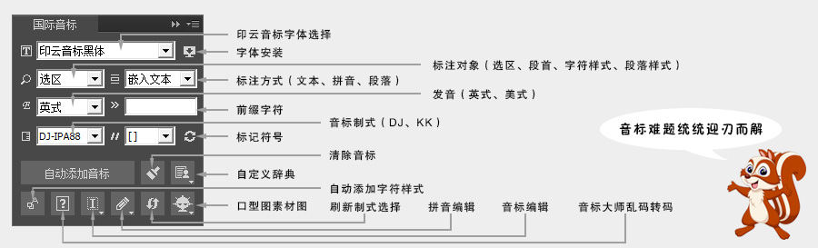 ①一键标注英文单词的国际音标内容; ②支持内文、拼音、段落等不同的标注形式; ③可选择英式读音和美式读音; ④可选择DJ和KK等不同的音标制式; ⑤支持字符样式和段落样式标注内容自动识别; ⑥音标辞典支持自定义功能; ⑦支持对已标注的音标内容自动添加字符样式; ⑧可以自动转换“音标大师”数据格式的文本内容; ⑨支持多款专用印云音标字体可选; ⑩可输出音标发音口型素材。
