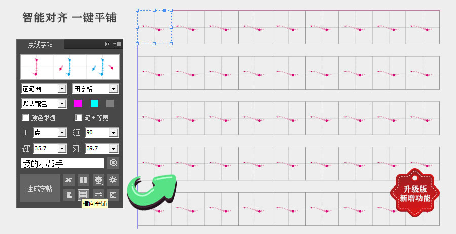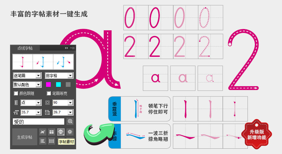 点线字帖(拆笔画字帖)插件是一款定制插件,可以输出点线组成的笔画字帖。 ①支持多种笔顺样式,其中包括逐笔画、单笔画和全笔画; ②支持多种背景格样式,其中包括田字格、米字格、九宫格等多种选项; ③笔画颜色可由用户选择,生成字帖后还可以通过对象样式进行重新调整; ④用户可控制字帖的字体号参数; ⑤支持笔画节点层次的选择; ⑥可去除笔锋,生成等宽笔画; ⑦支持汉字拼音信息,字体字号颜色可调整; ⑧所有笔画均为矢量对象,可无限放大同时确保高精度输出; 点线笔画字帖效果演示: