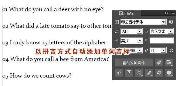 自动生成整段的音标内容插件可以自动在选择的文本中按段落的内容生成整段的音标内容,音标内容跟随文本段落。