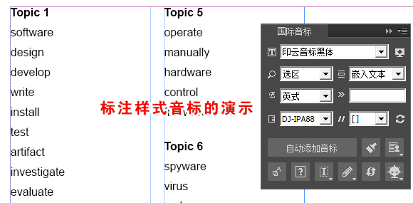 段落样式(或字符样式)标注可以选择段落样式(或字符样式)的内容进行音标的标注。可实现选择内容中的部分单词标注音标。