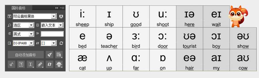 自动输出音标发音口型图插件提供音标口型图素材,可以一键输出到ID版面中,独家功能、方便快捷。