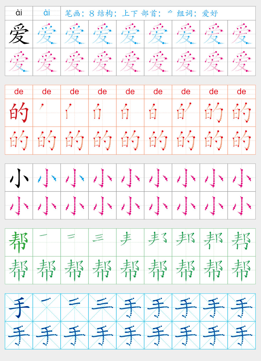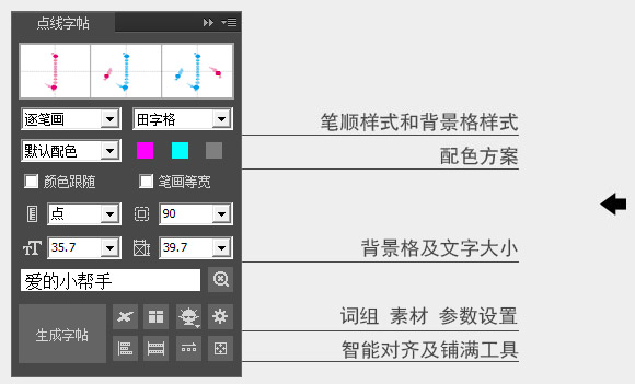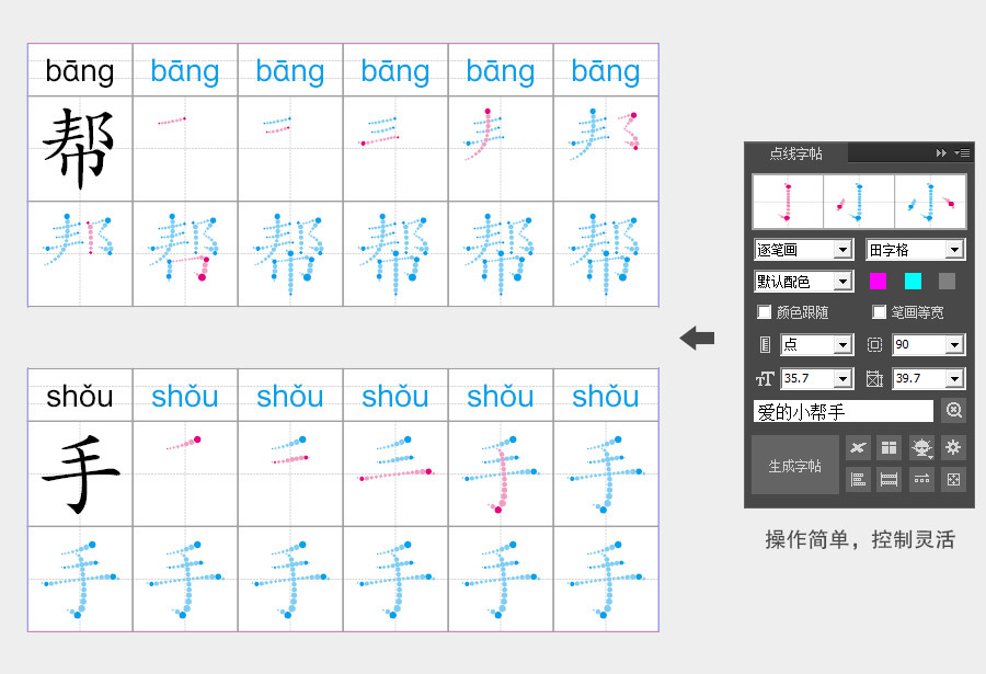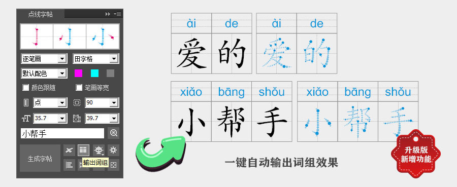 点线字帖(拆笔画字帖)插件是一款定制插件,可以输出点线组成的笔画字帖。 ①支持多种笔顺样式,其中包括逐笔画、单笔画和全笔画; ②支持多种背景格样式,其中包括田字格、米字格、九宫格等多种选项; ③笔画颜色可由用户选择,生成字帖后还可以通过对象样式进行重新调整; ④用户可控制字帖的字体号参数; ⑤支持笔画节点层次的选择; ⑥可去除笔锋,生成等宽笔画; ⑦支持汉字拼音信息,字体字号颜色可调整; ⑧所有笔画均为矢量对象,可无限放大同时确保高精度输出; 点线笔画字帖效果演示: